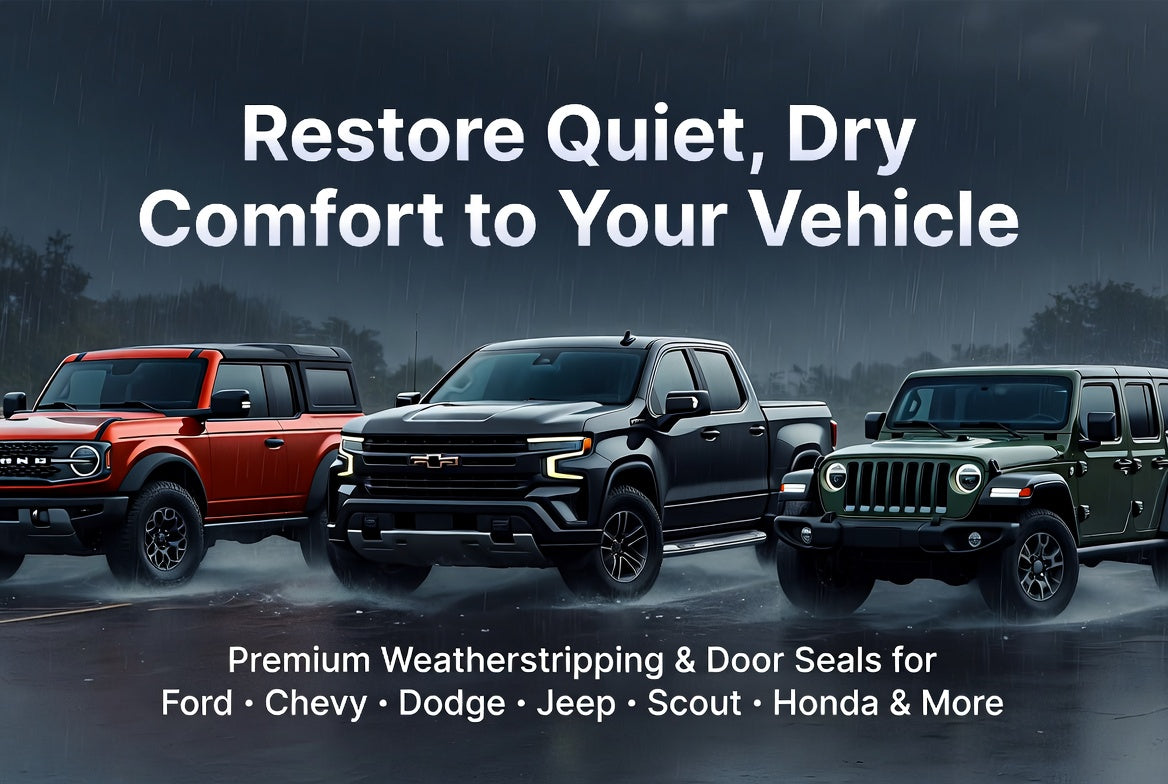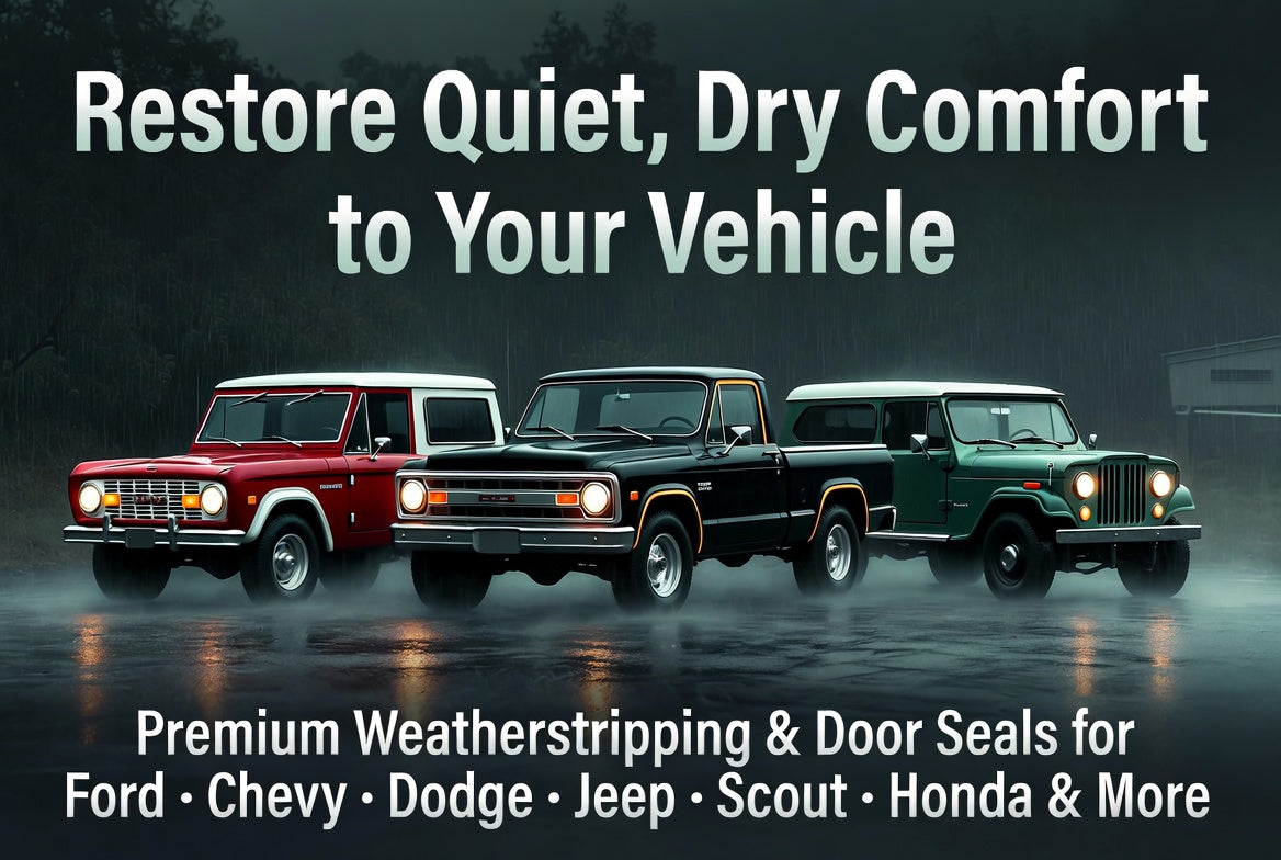 Tired of wind noise, water leaks, and dust invading your vehicle? Weatherstrip Depot specializes in high-quality OEM-style weatherstripping and door seals for a wide range of popular vehicles.We carry complete weatherstrip kits, door seals, window channels, belt weatherstrips, and roof rails for Ford, Chevrolet, GMC, Dodge, Jeep, International Scout, Honda, Oldsmobile, Pontiac, Hummer, and many more makes and models — from classic restorations to daily drivers.Our premium parts reduce cabin noise, block water and drafts, and restore factory-like comfort and protection. Whether you own a Ford Bronco, Mustang, F-150, Chevy Silverado, Dodge Ram, Jeep Wrangler, International Scout II, or another truck or SUV, we have the exact-fit weatherstripping you need.We’ve also expanded our inventory with durable plastic fuel tanks for the most popular trucks and SUVs.Shop with confidence — dedicated customer service, quality guaranteed, and free shipping on orders over $135.